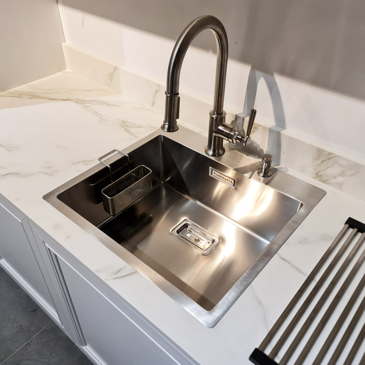 -chiuveta CookingAid Box Lux 57 cu finisaj inox satinat, cu o grosime a inoxului de 1.2 mm;